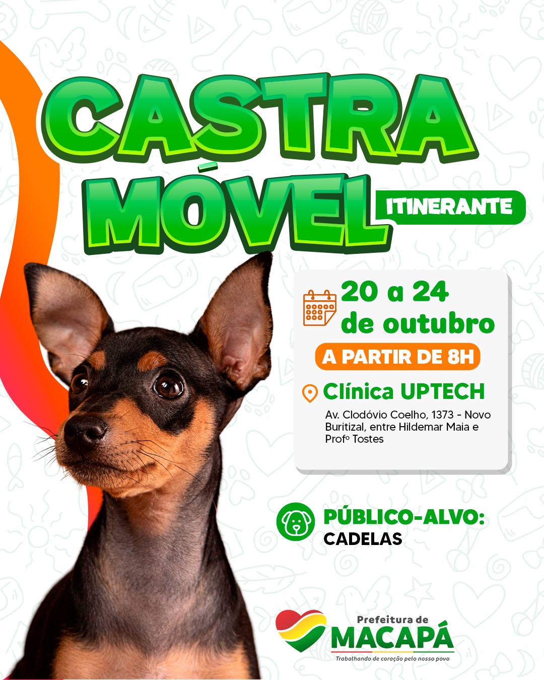 A Prefeitura de Macapá oferece castrações gratuitas de cães fêmeas por meio do Castramóvel de 20 a 24 de outubro. São 20 atendimentos por dia, a triagem ocorre das 8h às 12h, e as cirurgias são realizadas no período da tarde. Atualmente, o serviço funciona na Clínica Uptech, localizada na Rua Clodovio Coelho, esquina com a Hildemar Maia, nº 1373, no bairro Novo Buritizal.