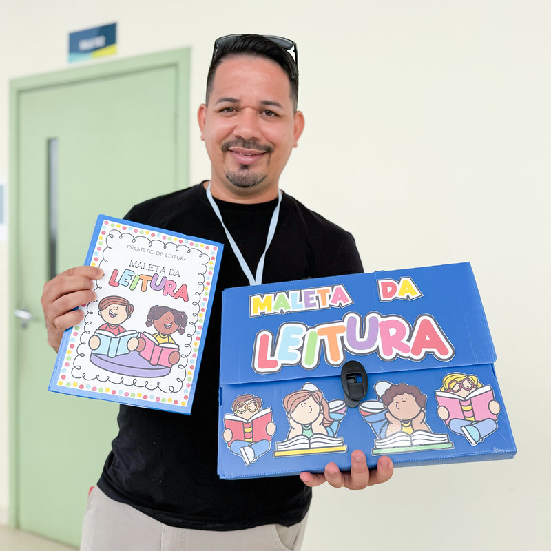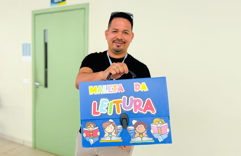 O professor Maciel Mendes, do 1º ano do Ensino Fundamental da Escola Municipal Elita Nunes, fez uma breve demonstração de seu projeto “Maleta da Leitura”, que estimula a criança a desenvolver sua leitura e escrita com a ajuda da família, uma vez que o material é levado para casa e as atividades são construídas em conjunto com os pais.