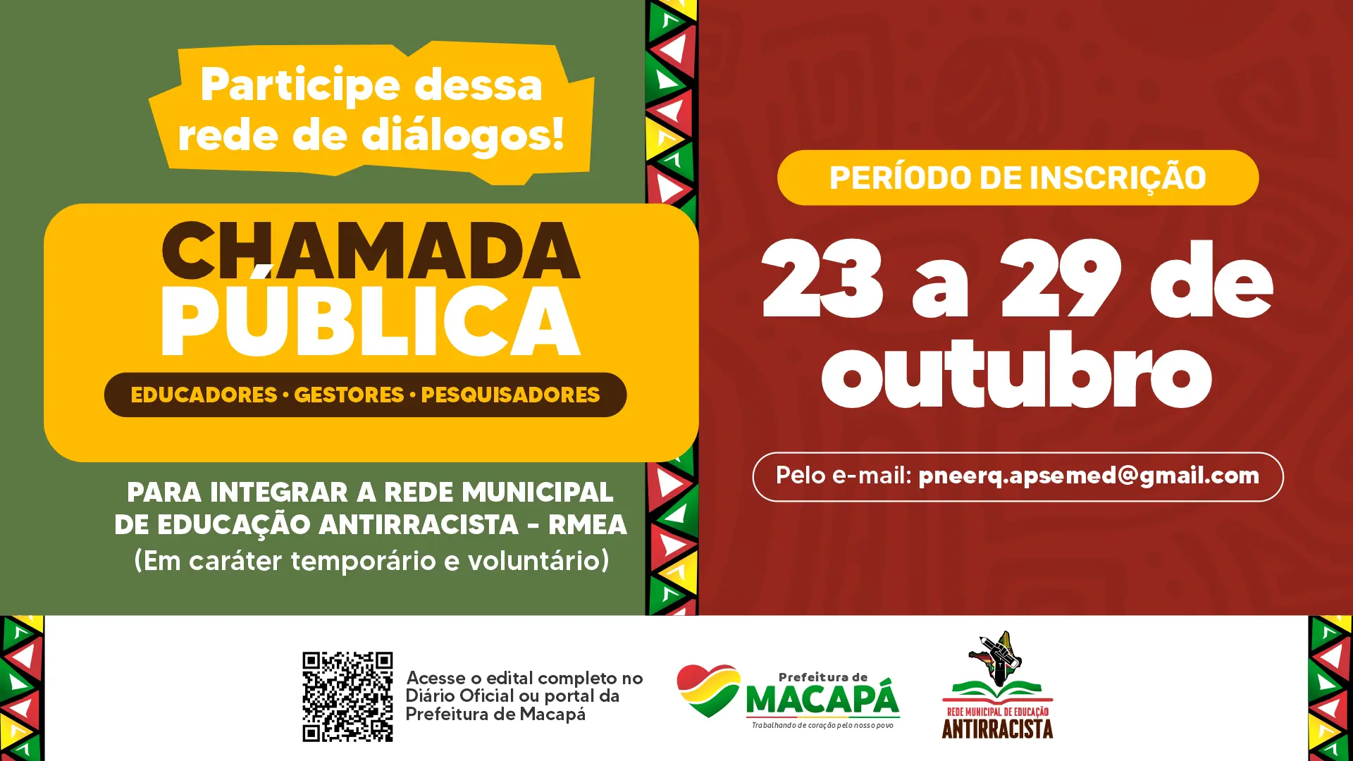 A Prefeitura de Macapá, em colaboração com a Coordenação Municipal da Política Nacional de Equidade, Educação para as Relações Étnico-Raciais e Educação Escolar Quilombola (PNEERQ), lança Chamada Pública para a criação da Rede Municipal de Educação Antirracista (RMEA).
